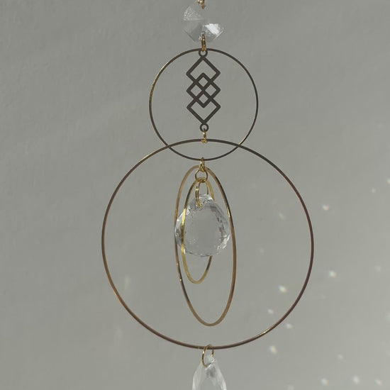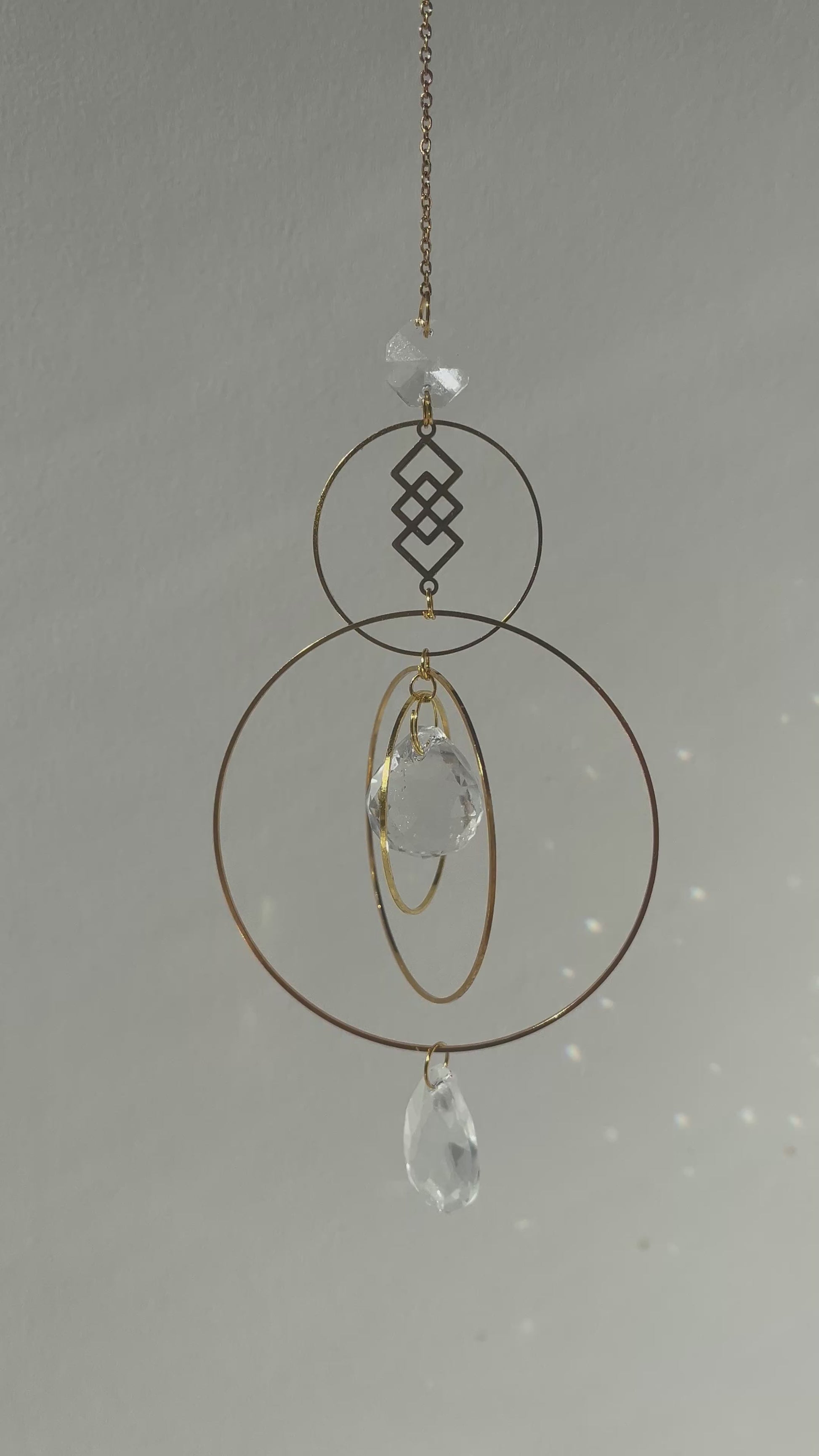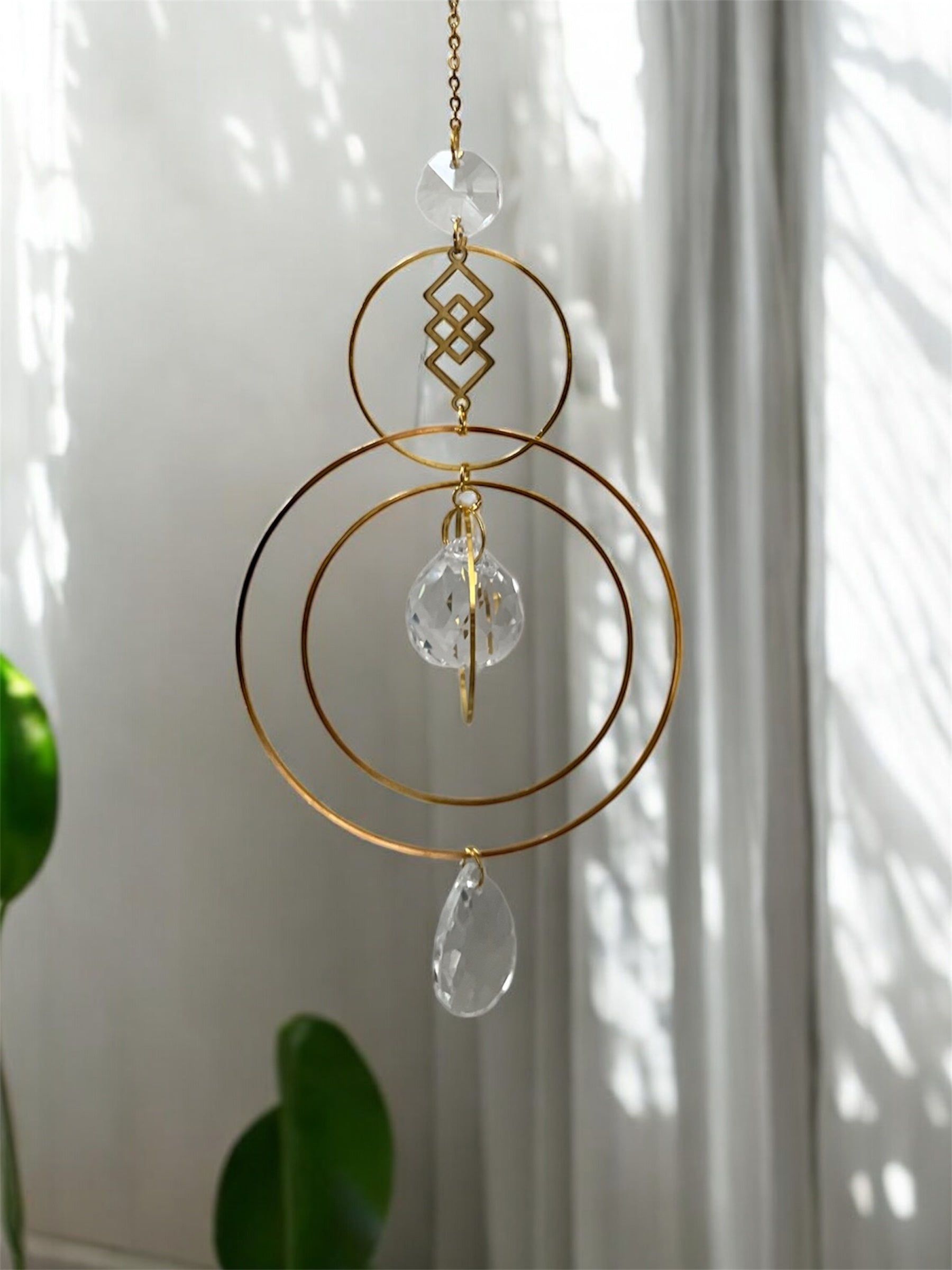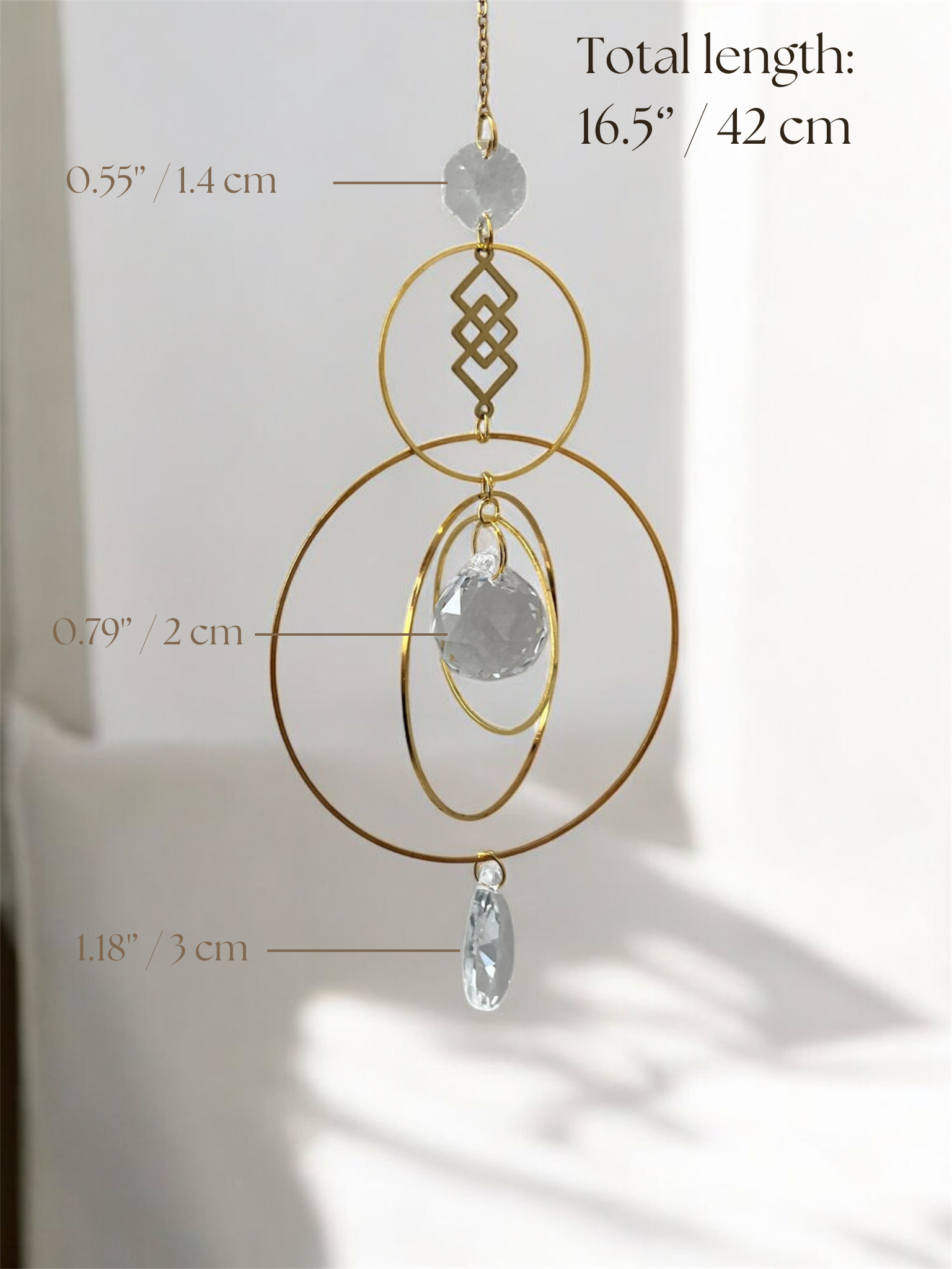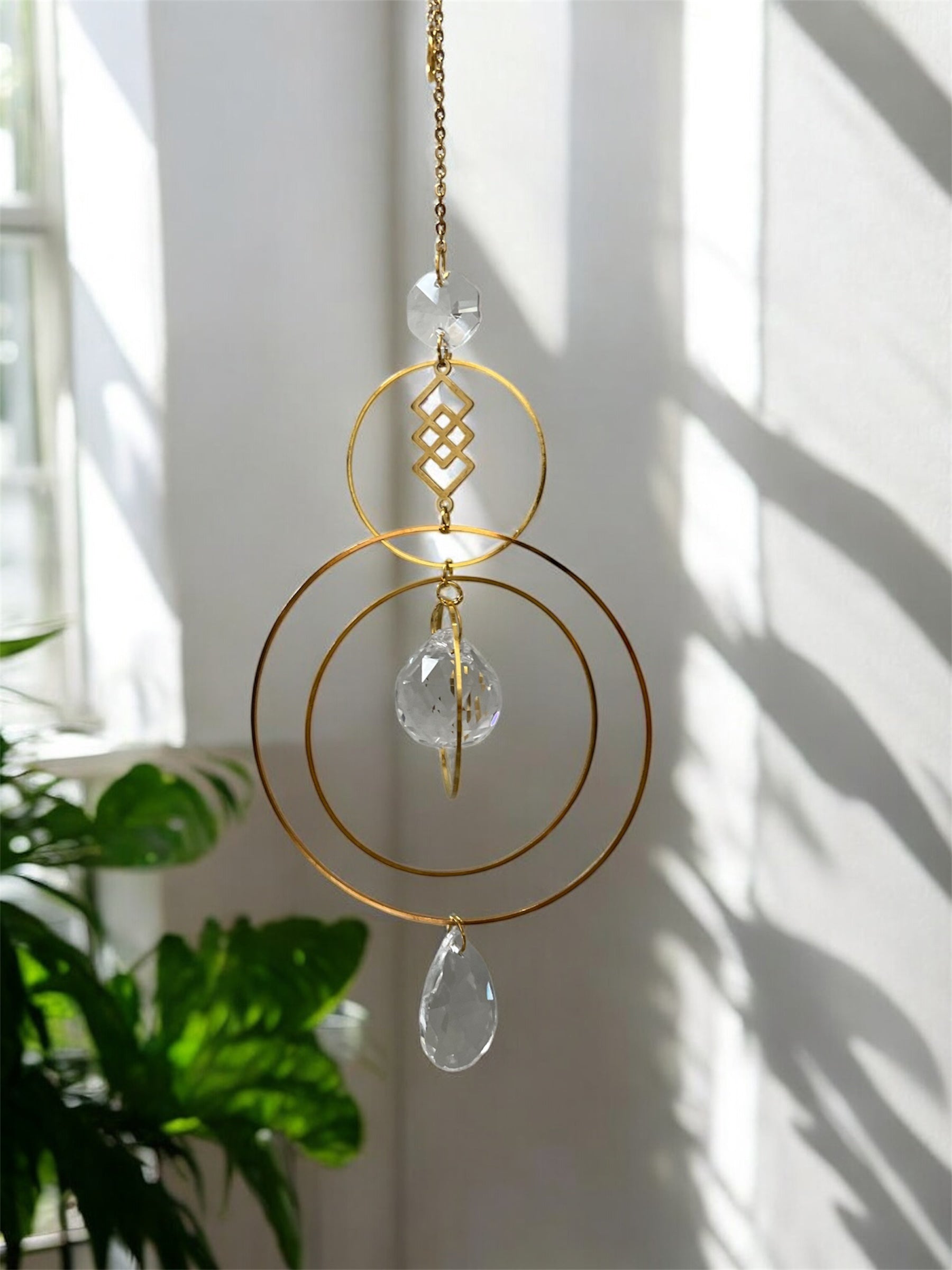 The Crystal Eclipse Ornament features gold-toned rings and crystal accents that catch sunlight to create beautiful light displays. Its elegant design, with a central crystal teardrop and knot motif, adds a peaceful touch to any indoor space.