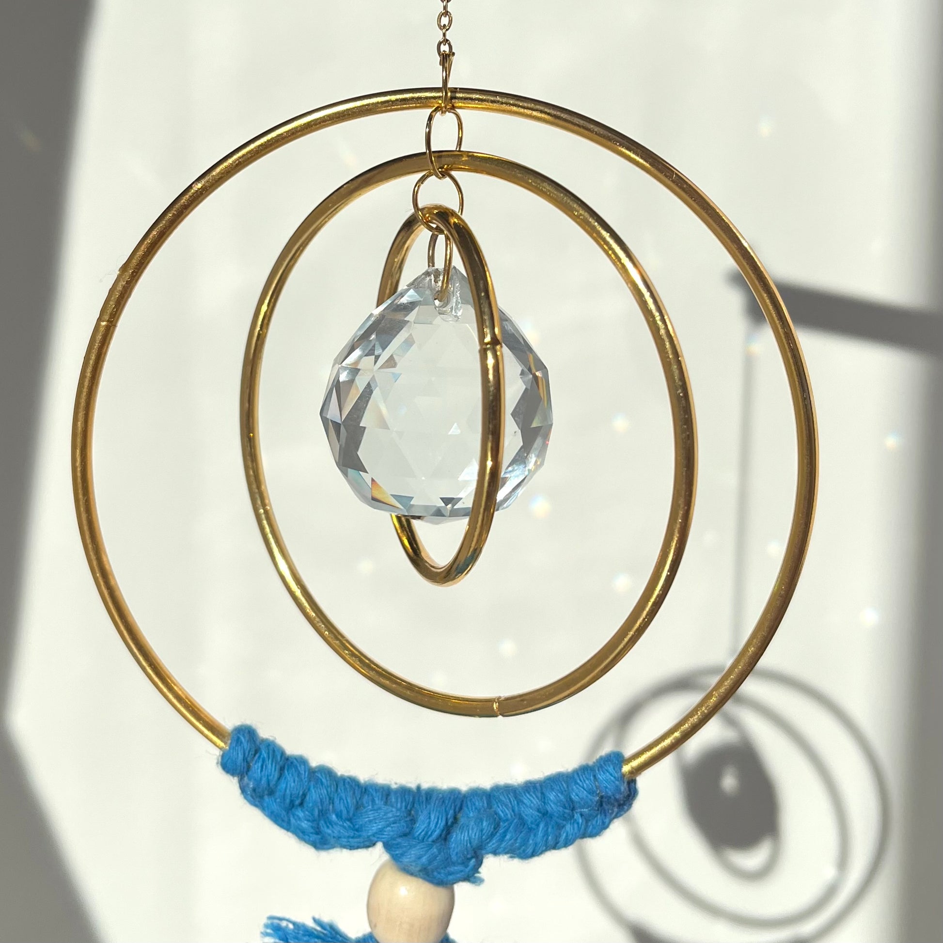 🌿At the heart of this piece is a large, faceted crystal surrounded by elegant gold rings, designed to catch and scatter sunlight across your room in dazzling patterns. A delicate blue feather adds a whimsical touch, acting as both a visual accent and a diffuser—just add a few drops of your favorite essential oil to infuse your space with calming aromas.